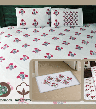 Bring home the timeless artistry of Jaipur with our handcrafted bedroom collection. From king-size cotton bed sheets to elegant bed runners, quilts, and cushion covers, every piece is hand block printed by skilled artisans. Featuring vibrant motifs, natural dyes, and breathable cotton, these creations blend heritage with everyday comfort. Whether for daily use or special occasions, our bedding transforms your space into a cozy haven of tradition and elegance
