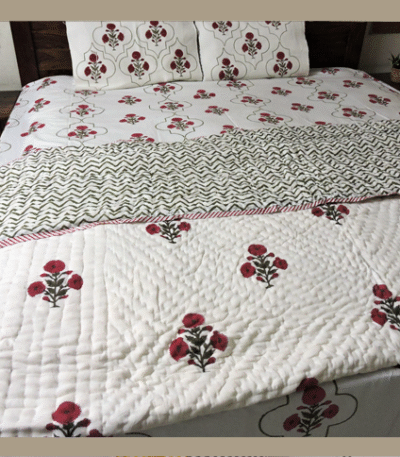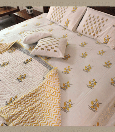 Bring home the timeless artistry of Jaipur with our handcrafted bedroom collection. From king-size cotton bed sheets to elegant bed runners, quilts, and cushion covers, every piece is hand block printed by skilled artisans. Featuring vibrant motifs, natural dyes, and breathable cotton, these creations blend heritage with everyday comfort. Whether for daily use or special occasions, our bedding transforms your space into a cozy haven of tradition and elegance