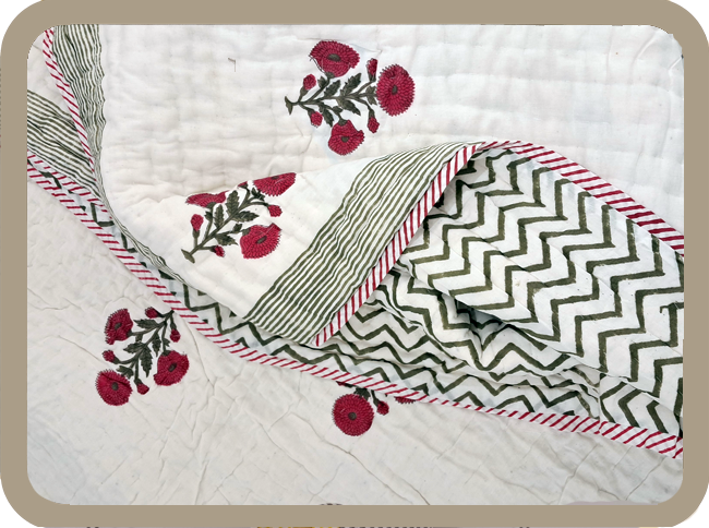 Hand block Printed Jaipuri Poppy Floral Mulmul Cotton Quilt / Razai for Double Bed