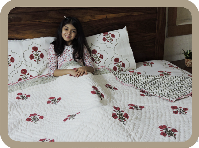 This elegant Jaipuri quilt is handcrafted using ultra-soft “Mulmul” fabric, perfect for summer and mild winters. It is filled with surgical cotton and ensures superior comfort, keeping you cosy all night. The handwoven stitching adds durability. This Jaipuri razai quilt is reversible, double bed size, and versatile enough for year-round use. Known for its incredible lightweight feel, softness, and warmth, it’s an ideal choice for all seasons