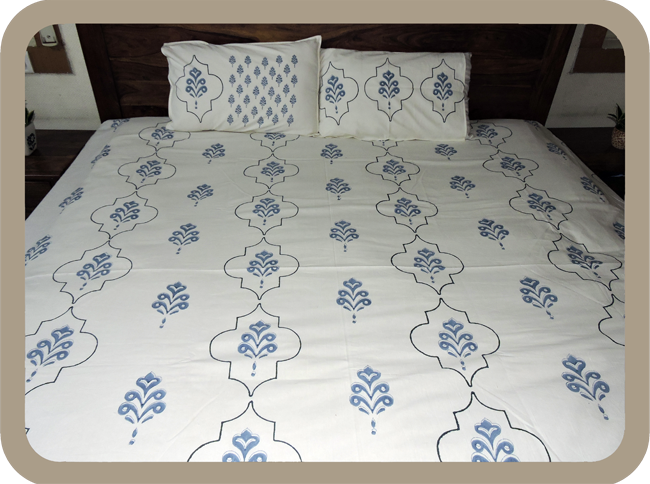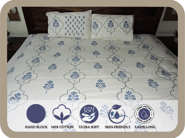 Premium Hand block Printed Blue Buta MG – King Size Bed Sheet with 2 Pillows