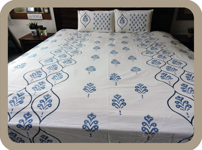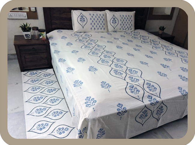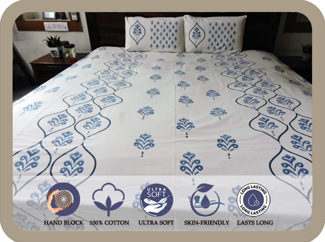 Premium Hand block Printed Blue Buta OGS – King Size Bed Sheet with 2 Pillows