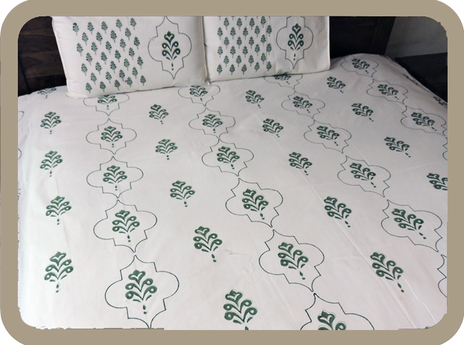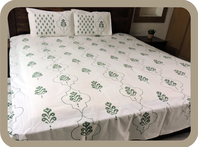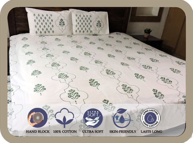 Premium Hand block Printed Green Buta MG – King Size Bed Sheet with 2 Pillows