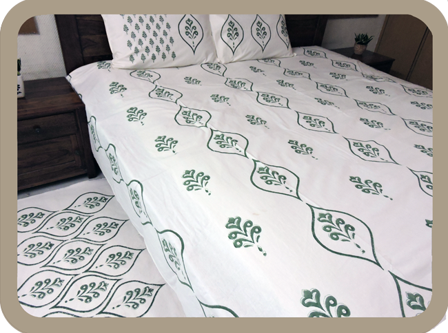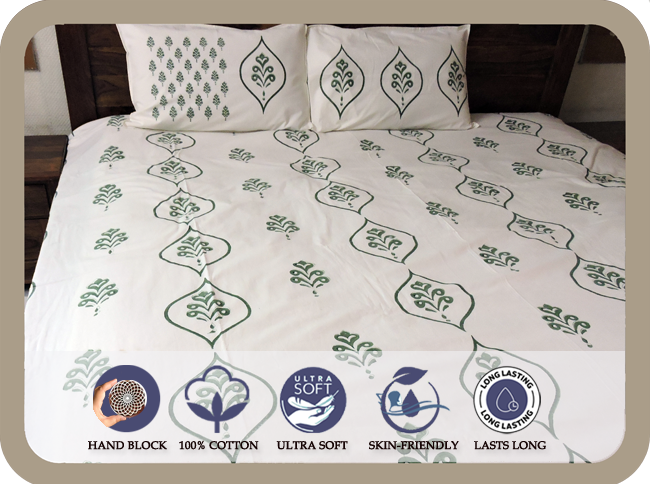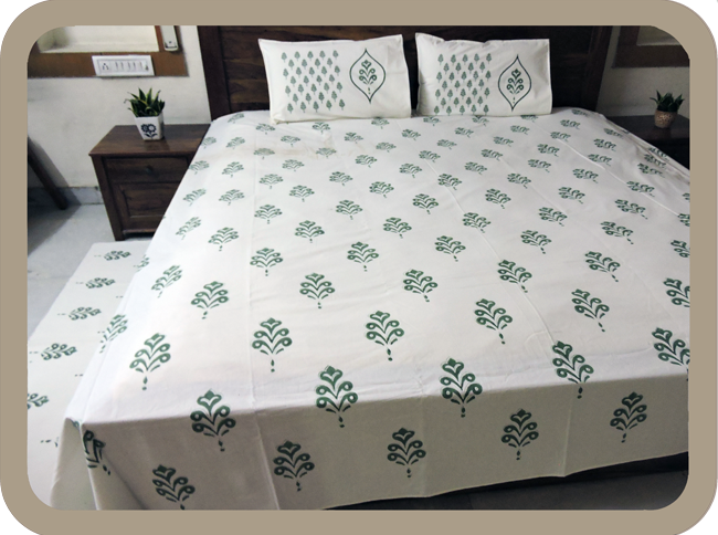 Premium Hand block Printed Green Buta OG – King Size Bed Sheet with 2 Pillows