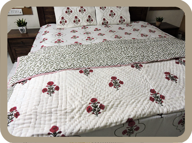 King Size Bed Sheet– 1 Piece Cotton Quilt : 1 Piece Cotton Canvas Bed Side Runner: 1 Piece Cotton Canvas Bath Room Floor Mat : 1 Piece Original price was: ₹10,300.00.₹7,199.00Current price is: ₹7,199.00. 1 in stock 1 in stock We ship orders within 2–4 business days, and delivery time may vary by location. Returns or exchanges are accepted within 7 days if the product is unused, unwashed, and in original condition. Since this is a handcrafted item, slight variations in color, print, or size are natural and not considered defects. Refunds/replacements are processed after quality checks. Hand or machine wash in cold water with mild detergent. Avoid bleach or harsh chemicals to preserve natural dyes. Dry in shade to maintain color vibrancy and iron on medium heat if needed. With each wash, the cotton becomes softer while retaining its beauty. Cultural Legacy Sustainable Craft This product is handmade. There may be small imperfections or differences in shape, size, and colour which are inherent to the process and what makes it unique. Actual colors may vary slightly due to your screen’s resolution and settings
