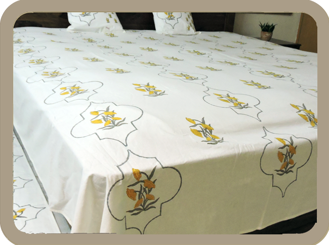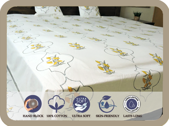 Premium Hand block Printed Yellow Floral MG King Size Bed Sheet with 2 Pillows