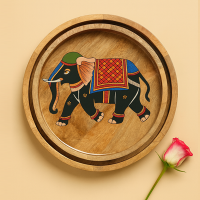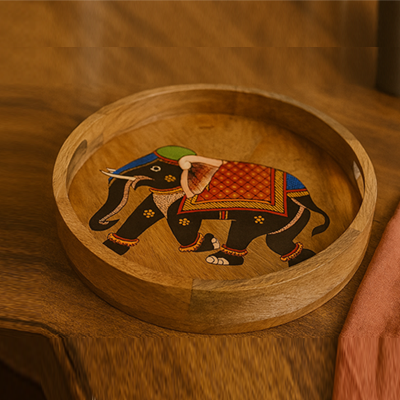 Step into timeless grandeur with Upper Rack’s Royal Heritage Collection Round Wooden Tray, featuring a hand-painted royal elephant—an eternal symbol of strength, wisdom, and prosperity. Crafted from premium natural wood, this tray radiates regal charm with its intricate Rajasthani artistry and rich, earthy finish. Perfect for serving, décor, or gifting, it blends traditional craftsmanship with a touch of royal elegance.